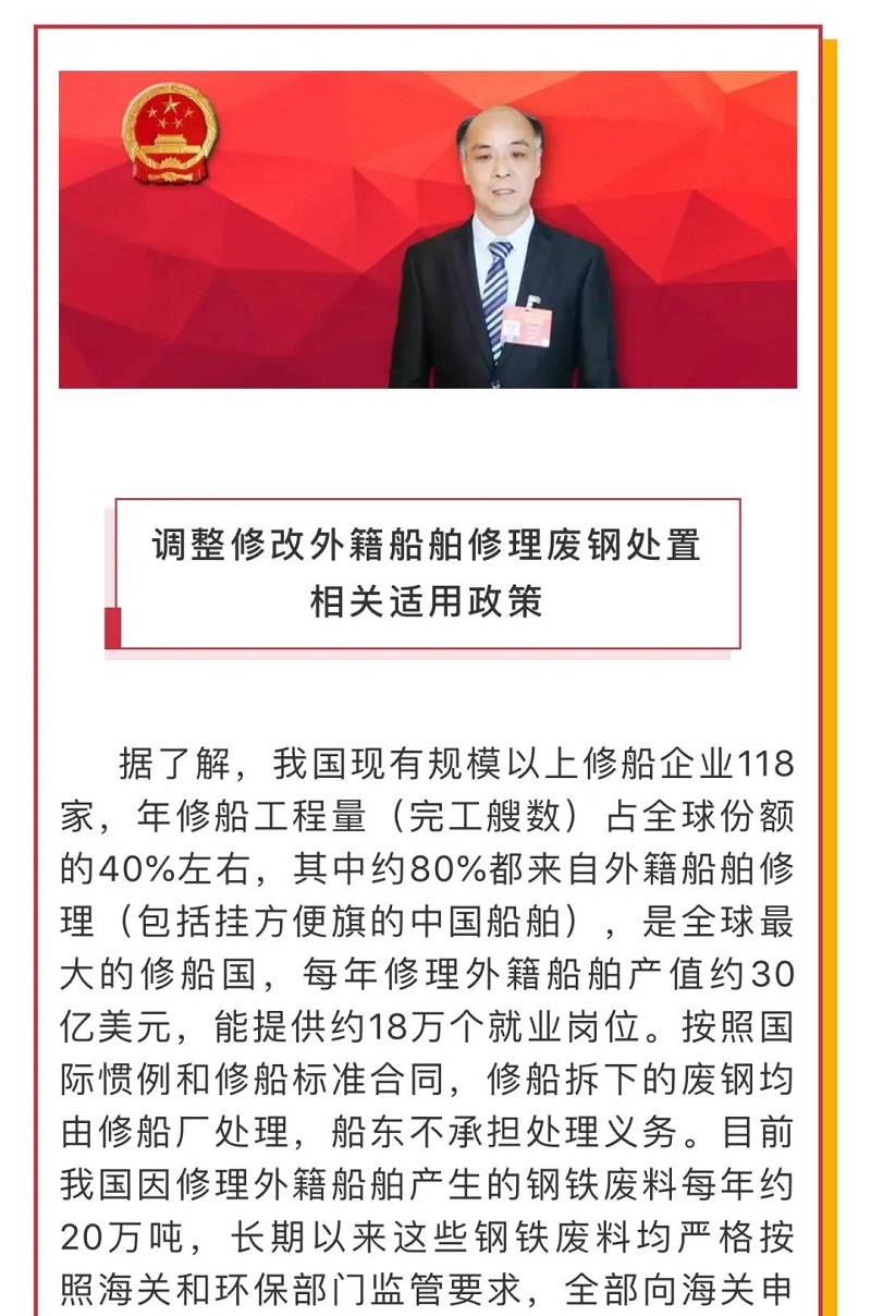 船舶看兩會|全國人大代表馬加友:修船廢鋼政策調(diào)整勢在必行!