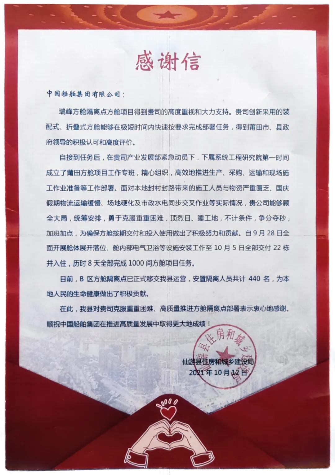 近日,中國船舶集團(tuán)收到了福建省莆田市仙游縣住房和城鄉(xiāng)建設(shè)局發(fā)來的一封感謝信。