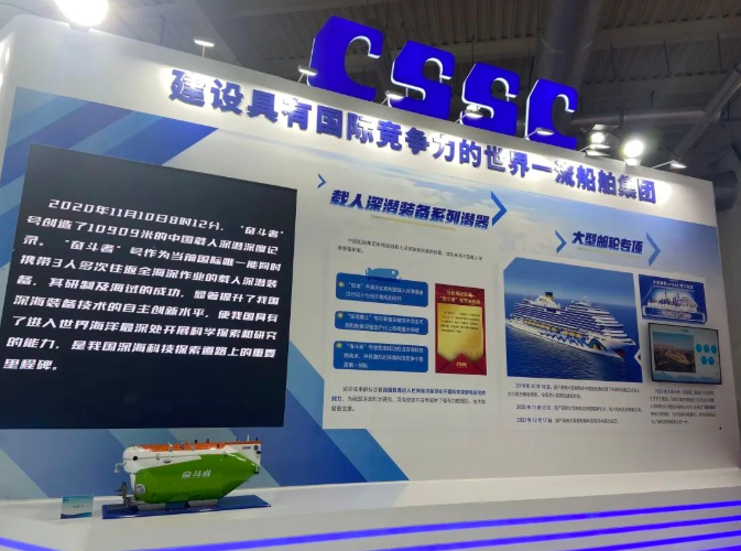 在重大科技專項工程展區(qū),中國船舶集團集中展示了在深海科學(xué)研究和海洋資源開發(fā)領(lǐng)域深化實施的“蛟龍”號、“深海勇士”號、“奮斗者”號三型載人深潛裝備等一批重大科技專項工程,以及取得的突破性、標(biāo)志性的成果。其中,展會現(xiàn)場展示的“奮斗者”號創(chuàng)造了10909米的中國載人深潛深度紀(jì)錄。