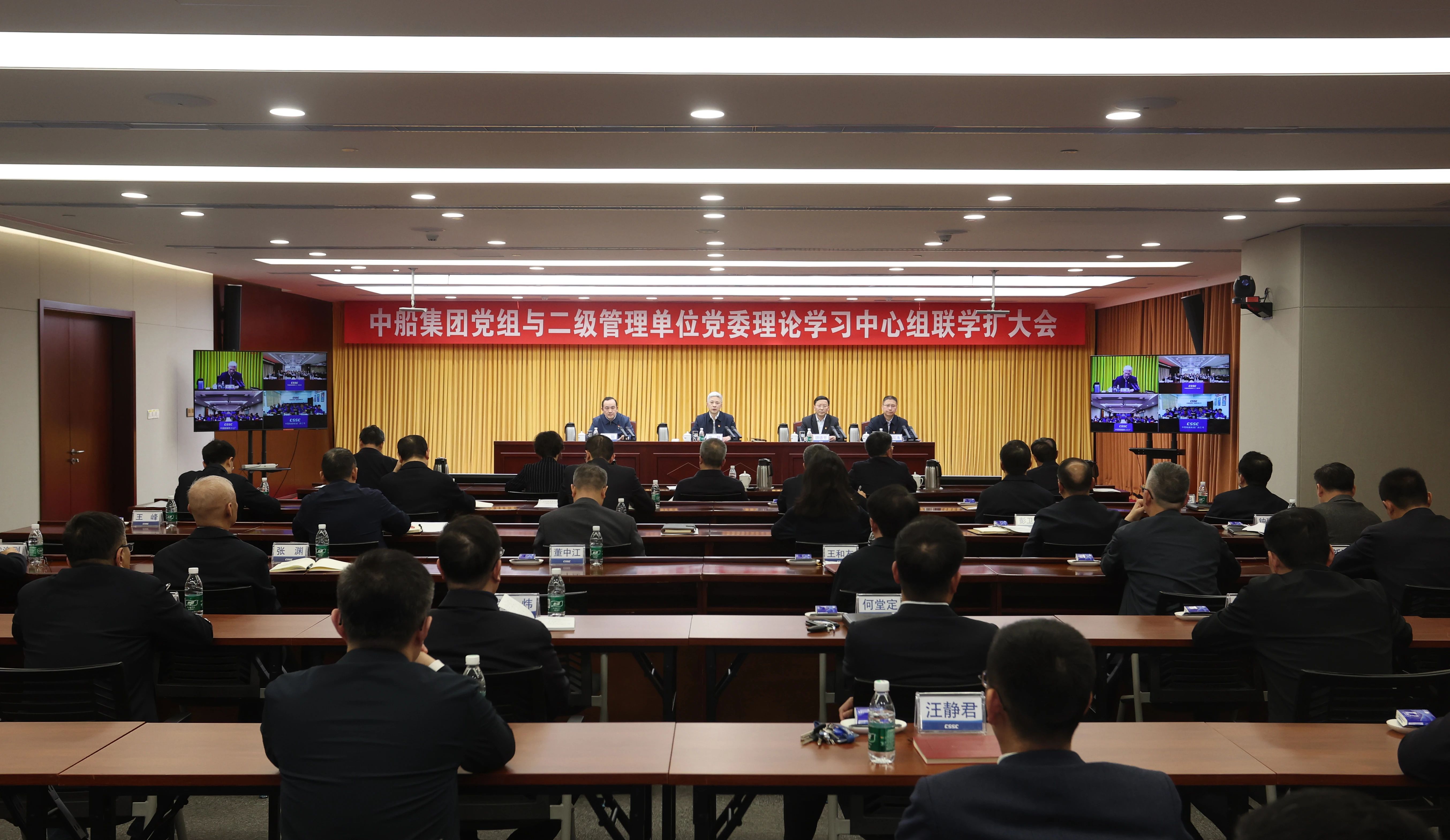 3月14日,中國船舶集團有限公司召開黨組與二級管理單位黨委理論學習中心組聯學擴大會,傳達學習全國兩會精神。中船集團黨組書記、董事長徐鵬主持會議并講話,集團公司黨組理論學習中心組成員參會。