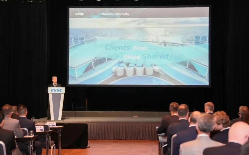 王國強向全球主要船東和合作伙伴宣講了“中船集團 智領深藍”的企業品牌理念,闡述了中船集團未來十年的“高端化、綠色化、智能化、共享化”戰略規劃方向,以及與全球廣大船東用戶“開放合作、共創共贏”的經營理念。他強調,作為全球船舶市場綠色低碳發展的引領者、踐行者和先行者,中船集團始終堅持創新驅動的發展理念,以構建海洋命運共同體為使命,持續加快核心技術協同攻關,不斷深化與全球航運企業及國際海事界的多贏合作。