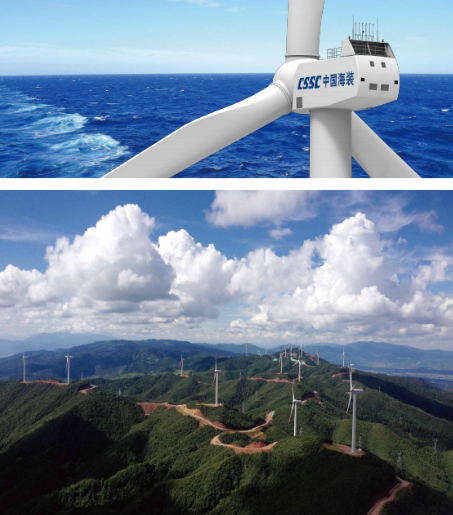 中國船舶集團擁有國內實力強勁的自主研發與生產體系,具備強大的機、電、液、控一體化裝備制造服務保障能力,形成了從葉片、齒輪箱、發電機、控制系統到機座、機架、塔筒、輪轂等全系列制造能力,從資源開發、零部件制造、整機研發、工程安裝、運維服務等全產業鏈保障能力,是我國唯一具備較完整風電裝備研制生產服務保障體系的專業化集團。