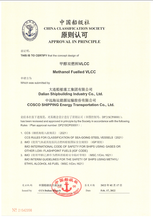 2020年,大船集團研發的液氨動力超大型油船(VLCC)分別取得美國船級社(ABS)和中國船級社(CCS)頒發的AIP證書。