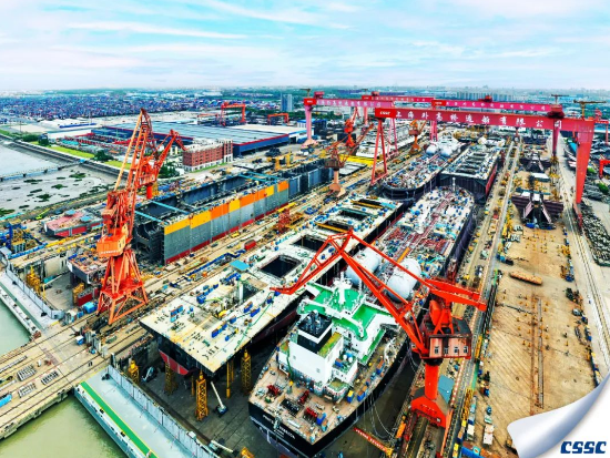 在高壓防疫狀態下,全面推進復工復產,船塢碼頭開足馬力建造,船塢中民船、海工、郵輪并排建造。