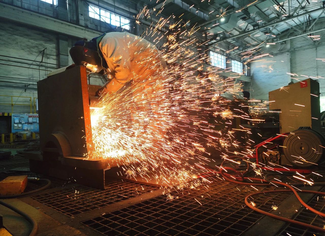 武漢船機——鋼構制造部員工穿著厚厚的防護服進行焊接工作。