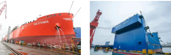 1月31日,外高橋造船建造的15.8萬噸蘇伊士型原油船H1589船及7000TEU集裝箱船H1656船順利下塢。
