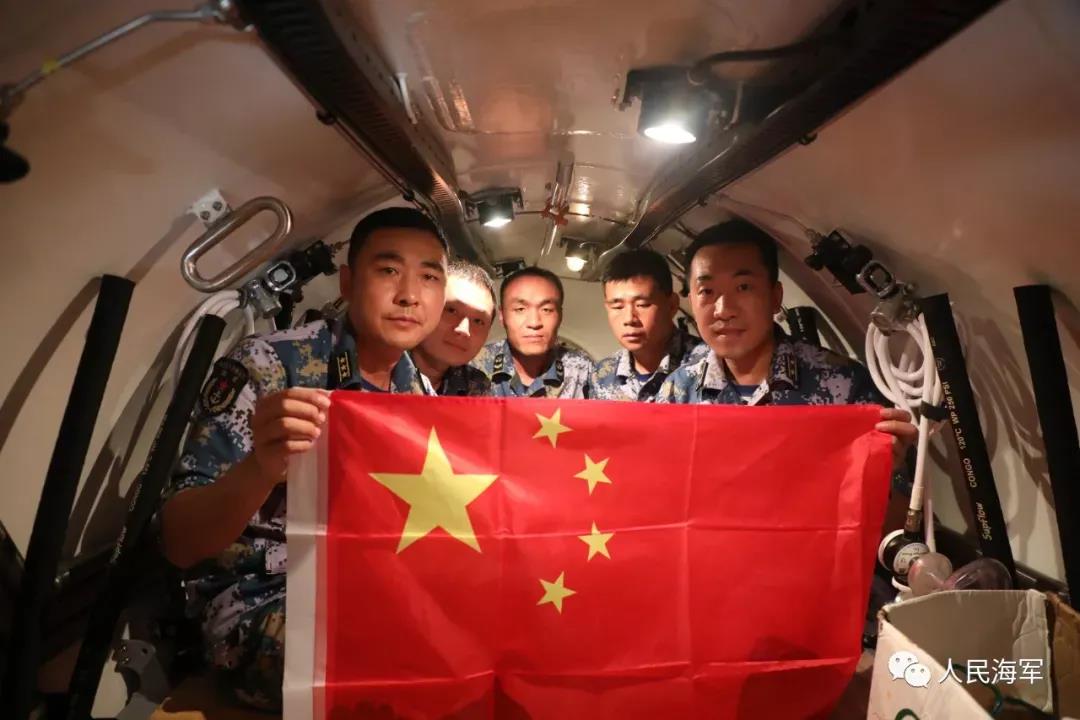 經(jīng)過2個小時的緊張下潛,深潛救生艇終于到達(dá),并突破指定極限下潛深度,官兵們展開五星紅旗驕傲地宣布“我的戰(zhàn)位在海底531.1米。