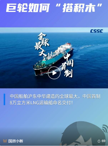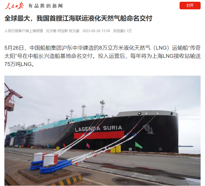 5月26日,中國(guó)船舶集團(tuán)旗下滬東中華聯(lián)合中船貿(mào)易建造的8萬(wàn)立方米液化天然氣(LNG)運(yùn)輸船“傳奇太陽(yáng)”號(hào)在長(zhǎng)興造船基地命名交付。“傳奇太陽(yáng)”號(hào)是全球最大淺水航道第四代、我國(guó)首款首制首艘江海聯(lián)運(yùn)型LNG船,填補(bǔ)了中國(guó)淺水航道LNG船的空白,在該細(xì)分市場(chǎng)占有率最高,有望成為中國(guó)船舶制造的又一精品船型。