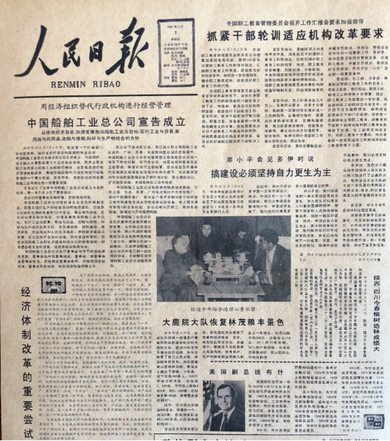 “改革開放是決定當代中國命運的關鍵一招。”1982年5月7日《人民日報》頭版刊載文章:“用經濟組織替代行政機構進行經營管理——中國船舶工業總公司宣布成立”,標題下文又著重強調“以提高經濟效益,加速我國船舶工業為目標,實行工業與貿易,軍用品與民用品,造船與修船,科研與生產相結合的方針”。頭版還發表了以“經濟體制改革的重要嘗試”為標題的“社論”。在這期《人民日報》的頭版還刊發了鄧小平同志接待外賓時的講話“搞建設,必須堅持自力更生為主”。